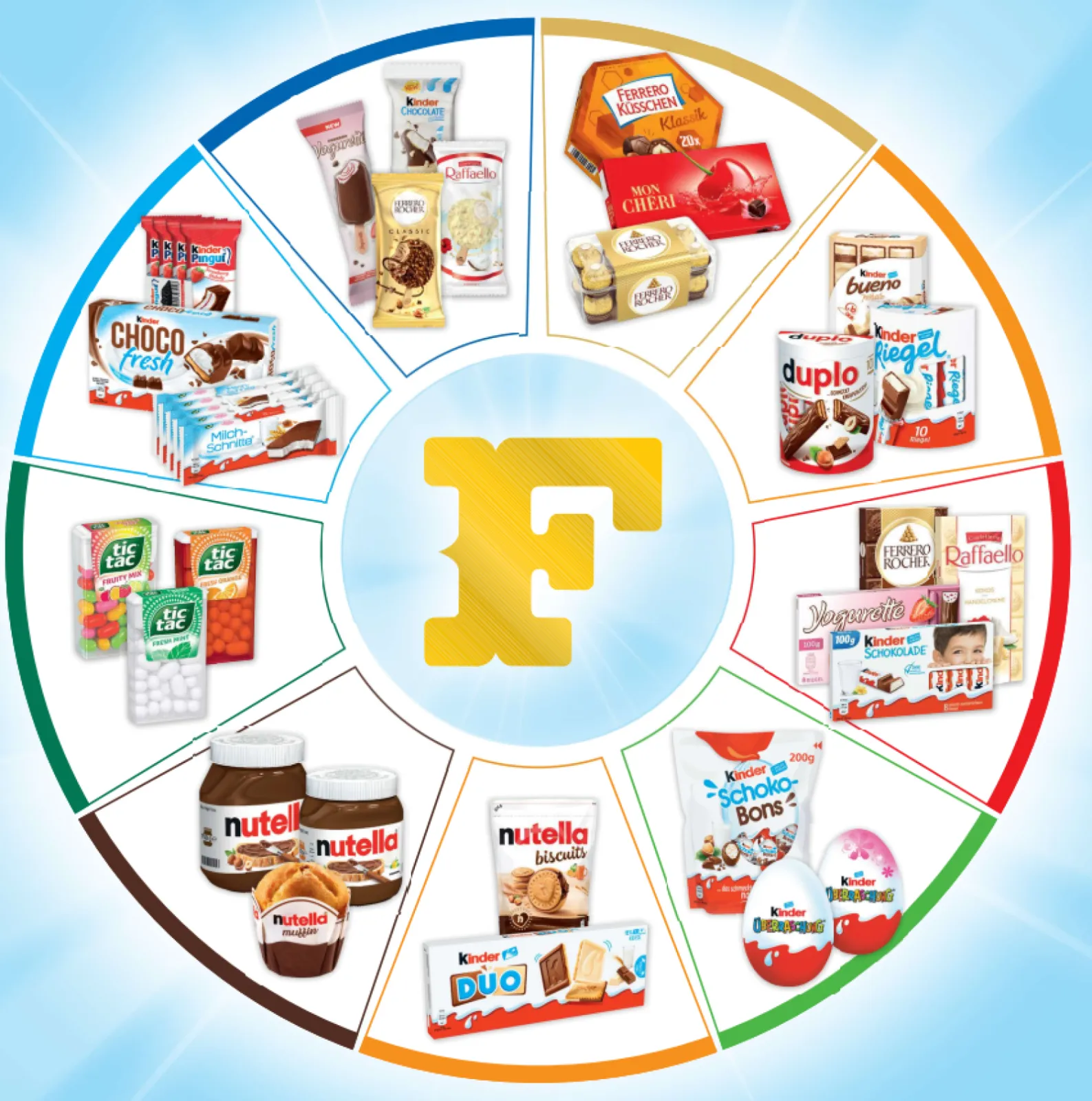 Ferrero products: Nutella, Bueno, kinder happy Hippo, kinder Duo, Hanuta, kinder Riegel, Kinder country, duplo chocnut, kinder cards, kinder joy, Überraschungs-Ei, tic tac X-fresh, Milch-Schnitte, Ferrero Eis, Raffaelo, Rocher